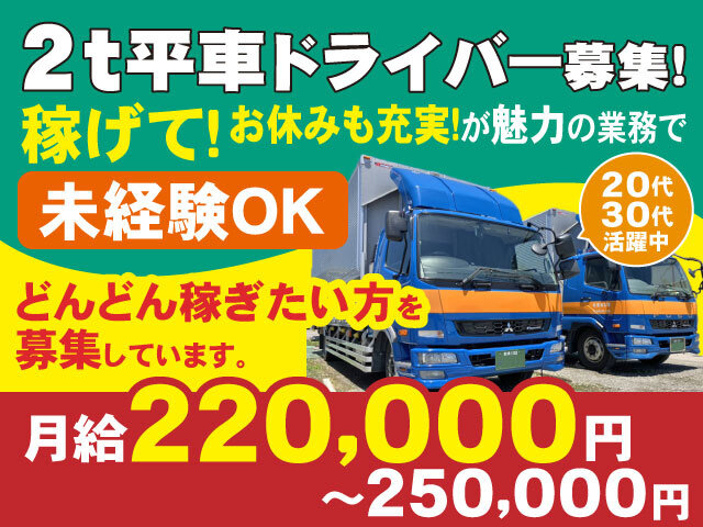 正2t平車ドライバー/近県チャーター便 未経験でも月給22万円以上 完全週休2日/朝5時~14時の勤務