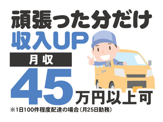 - 日給18,000円 ~ 【頑張りをしっかり評価して売上に反映】 常に業務量が安定しており、ドライバーのみなさまにお仕事を供給できています。 「たくさん稼ぎたい!」という方も安心してご応募ください。