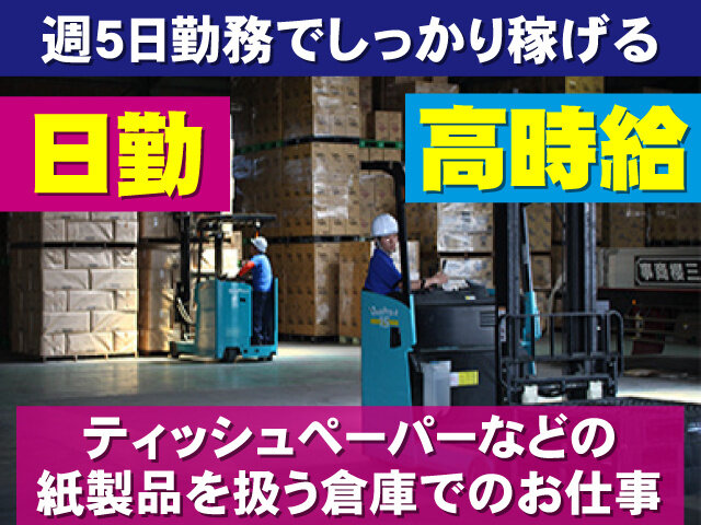 アパ日勤/高時給/週5日勤務でしっかり稼げる/月収21万円以上可/ ティッシュなどの紙製品を扱う倉庫