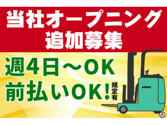 派当社オープニング追加募集 未経験OKのフォークリフト作業 20代~60歳迄の男女活躍中!前払い制度有